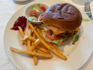 海上巡航:整天朝溫哥華前進,船速比內灣快,因此船身有些晃動。中午時,我們去了6樓船尾的凱契根餐廳用餐,漢堡味道還不錯,算是換了口味。不過,中文菜單上的 "Mac & Cheese" 居然翻譯成「起司大麥克」,讓我不小心點了錯的,應該翻譯成「起司通心麵」才對。